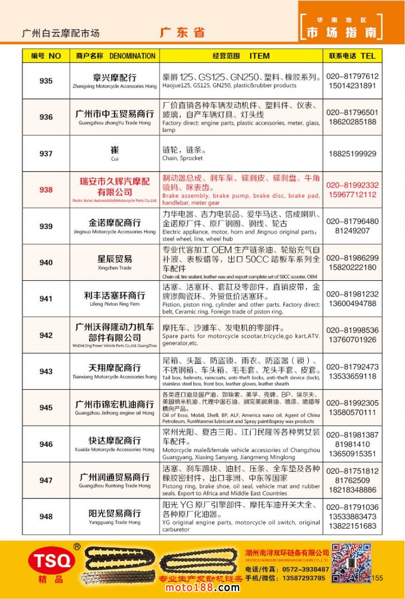 最新升級(jí)的《摩配華南市場(chǎng)指南》升級(jí)版在第76屆廣州全國摩托車及配件展示交易會(huì)上首發(fā),歡迎朋友們來3109號(hào)展位。接著將在廣州、重慶摩配市場(chǎng)全面派送,在廣州福星、松南市場(chǎng)門口、及白云三個(gè)檔口常年設(shè)立發(fā)行窗口;發(fā)行至廣州、重慶、江浙的幾大板塊主要廠家及全國的主要摩配市場(chǎng)。