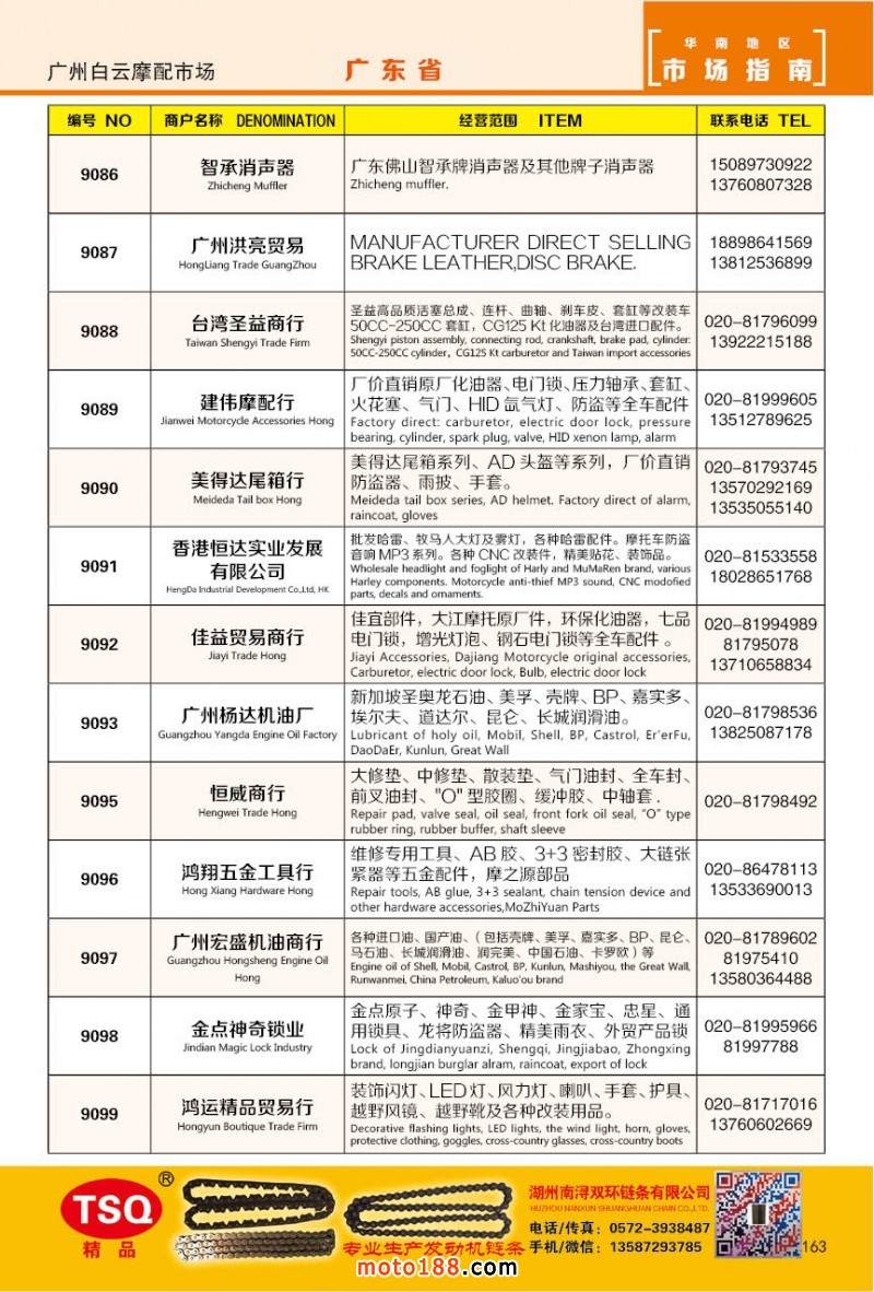 最新升級的《摩配華南市場指南》升級版在第76屆廣州全國摩托車及配件展示交易會上首發(fā),歡迎朋友們來3109號展位。接著將在廣州、重慶摩配市場全面派送,在廣州福星、松南市場門口、及白云三個檔口常年設(shè)立發(fā)行窗口;發(fā)行至廣州、重慶、江浙的幾大板塊主要廠家及全國的主要摩配市場。