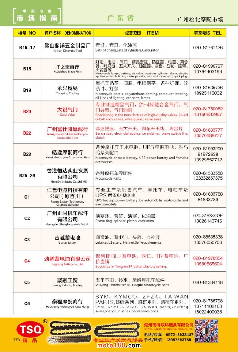 最新升級(jí)的《摩配華南市場(chǎng)指南》升級(jí)版在第76屆廣州全國摩托車及配件展示交易會(huì)上首發(fā),歡迎朋友們來3109號(hào)展位。接著將在廣州、重慶摩配市場(chǎng)全面派送,在廣州福星、松南市場(chǎng)門口、及白云三個(gè)檔口常年設(shè)立發(fā)行窗口;發(fā)行至廣州、重慶、江浙的幾大板塊主要廠家及全國的主要摩配市場(chǎng)。