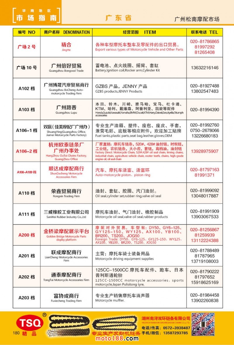 最新升級的《摩配華南市場指南》升級版在第76屆廣州全國摩托車及配件展示交易會上首發(fā),歡迎朋友們來3109號展位。接著將在廣州、重慶摩配市場全面派送,在廣州福星、松南市場門口、及白云三個檔口常年設立發(fā)行窗口;發(fā)行至廣州、重慶、江浙的幾大板塊主要廠家及全國的主要摩配市場。