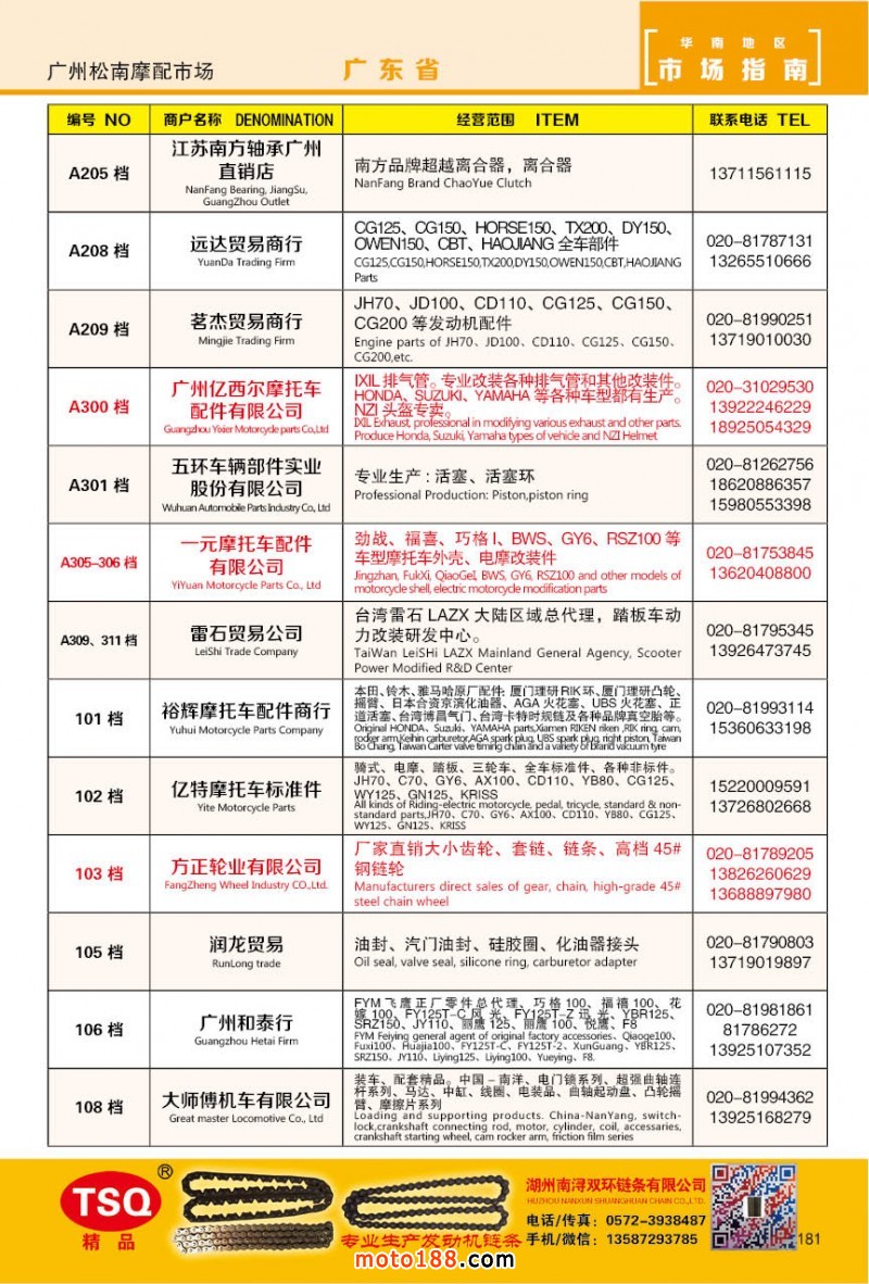 最新升級的《摩配華南市場指南》升級版在第76屆廣州全國摩托車及配件展示交易會上首發(fā),歡迎朋友們來3109號展位。接著將在廣州、重慶摩配市場全面派送,在廣州福星、松南市場門口、及白云三個檔口常年設立發(fā)行窗口;發(fā)行至廣州、重慶、江浙的幾大板塊主要廠家及全國的主要摩配市場。