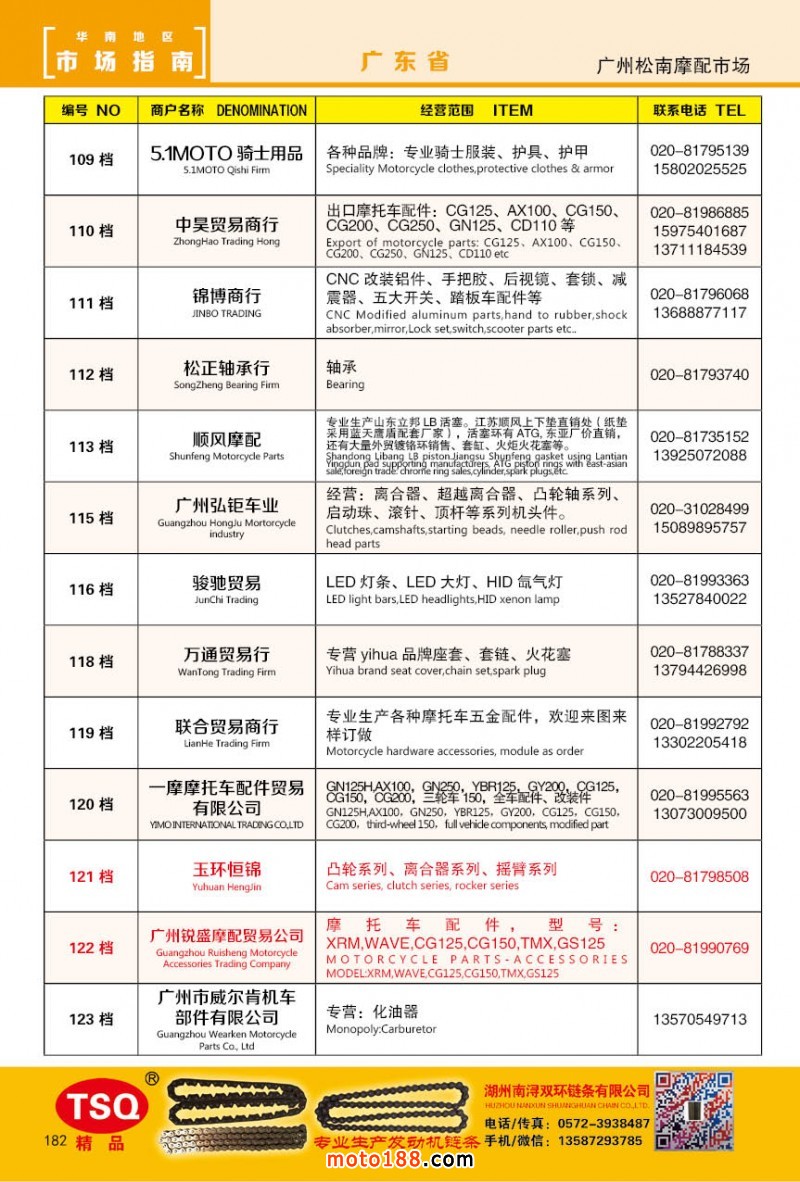 最新升級的《摩配華南市場指南》升級版在第76屆廣州全國摩托車及配件展示交易會上首發(fā),歡迎朋友們來3109號展位。接著將在廣州、重慶摩配市場全面派送,在廣州福星、松南市場門口、及白云三個檔口常年設立發(fā)行窗口;發(fā)行至廣州、重慶、江浙的幾大板塊主要廠家及全國的主要摩配市場。