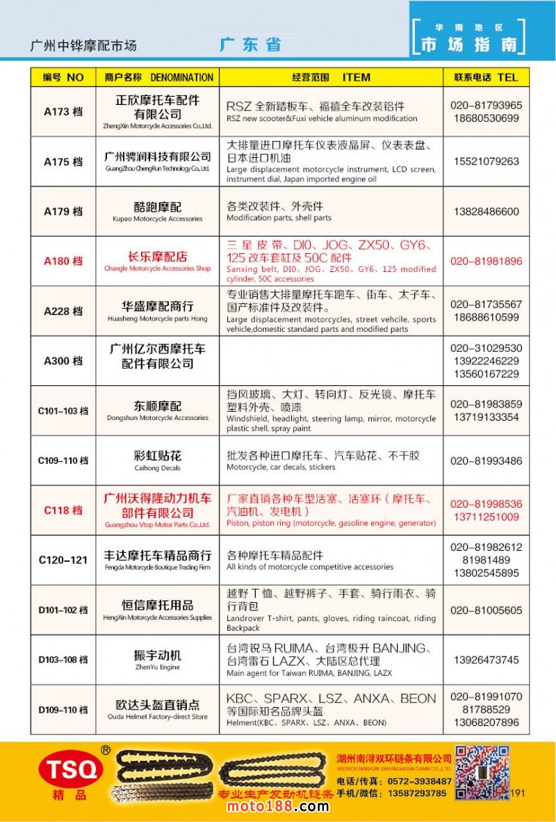 最新升級(jí)的《摩配華南市場(chǎng)指南》升級(jí)版在第76屆廣州全國摩托車及配件展示交易會(huì)上首發(fā),歡迎朋友們來3109號(hào)展位。接著將在廣州、重慶摩配市場(chǎng)全面派送,在廣州福星、松南市場(chǎng)門口、及白云三個(gè)檔口常年設(shè)立發(fā)行窗口;發(fā)行至廣州、重慶、江浙的幾大板塊主要廠家及全國的主要摩配市場(chǎng)。
