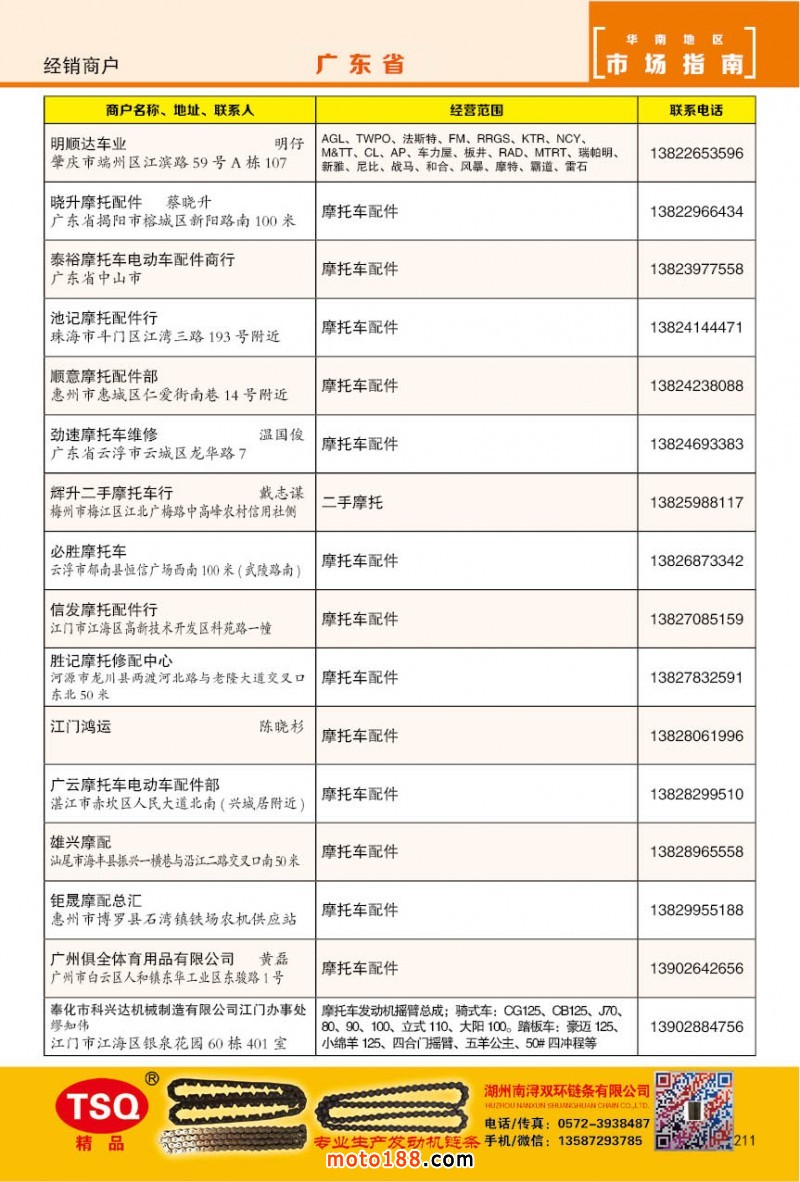 最新升級(jí)的《摩配華南市場(chǎng)指南》升級(jí)版在第76屆廣州全國(guó)摩托車(chē)及配件展示交易會(huì)上首發(fā),歡迎朋友們來(lái)3109號(hào)展位。接著將在廣州、重慶摩配市場(chǎng)全面派送,在廣州福星、松南市場(chǎng)門(mén)口、及白云三個(gè)檔口常年設(shè)立發(fā)行窗口;發(fā)行至廣州、重慶、江浙的幾大板塊主要廠家及全國(guó)的主要摩配市場(chǎng)。