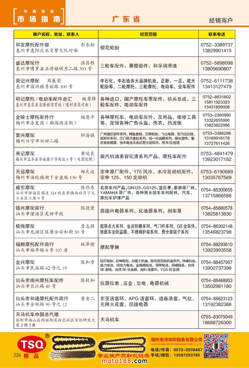 最新升級(jí)的《摩配華南市場(chǎng)指南》升級(jí)版在第76屆廣州全國(guó)摩托車(chē)及配件展示交易會(huì)上首發(fā),歡迎朋友們來(lái)3109號(hào)展位。接著將在廣州、重慶摩配市場(chǎng)全面派送,在廣州福星、松南市場(chǎng)門(mén)口、及白云三個(gè)檔口常年設(shè)立發(fā)行窗口;發(fā)行至廣州、重慶、江浙的幾大板塊主要廠家及全國(guó)的主要摩配市場(chǎng)。
