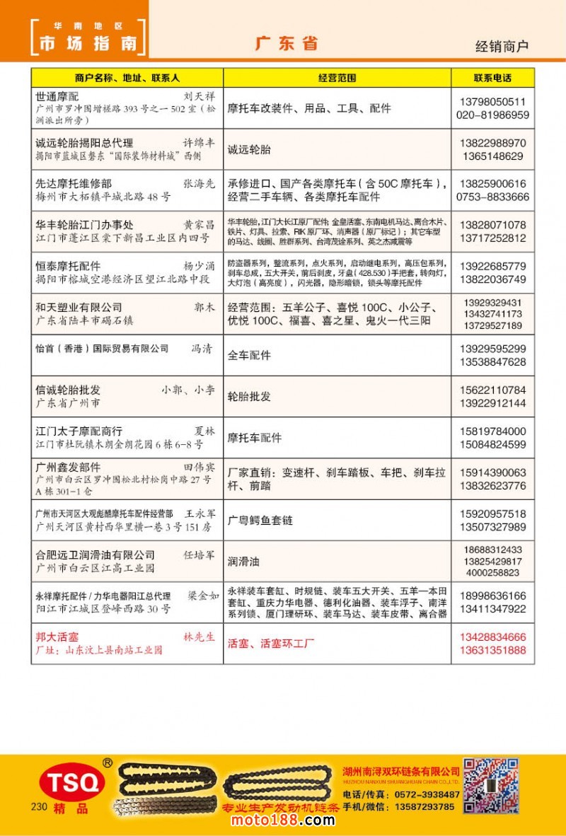 最新升級(jí)的《摩配華南市場(chǎng)指南》升級(jí)版在第76屆廣州全國(guó)摩托車(chē)及配件展示交易會(huì)上首發(fā),歡迎朋友們來(lái)3109號(hào)展位。接著將在廣州、重慶摩配市場(chǎng)全面派送,在廣州福星、松南市場(chǎng)門(mén)口、及白云三個(gè)檔口常年設(shè)立發(fā)行窗口;發(fā)行至廣州、重慶、江浙的幾大板塊主要廠家及全國(guó)的主要摩配市場(chǎng)。