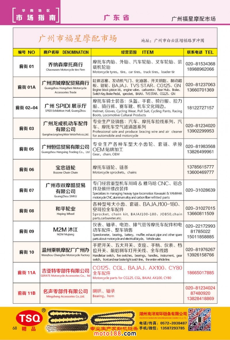 最新升級的《摩配華南市場指南》升級版在第76屆廣州全國摩托車及配件展示交易會上首發(fā),歡迎朋友們來3109號展位。接著將在廣州、重慶摩配市場全面派送,在廣州福星、松南市場門口、及白云三個檔口常年設(shè)立發(fā)行窗口;發(fā)行至廣州、重慶、江浙的幾大板塊主要廠家及全國的主要摩配市場。