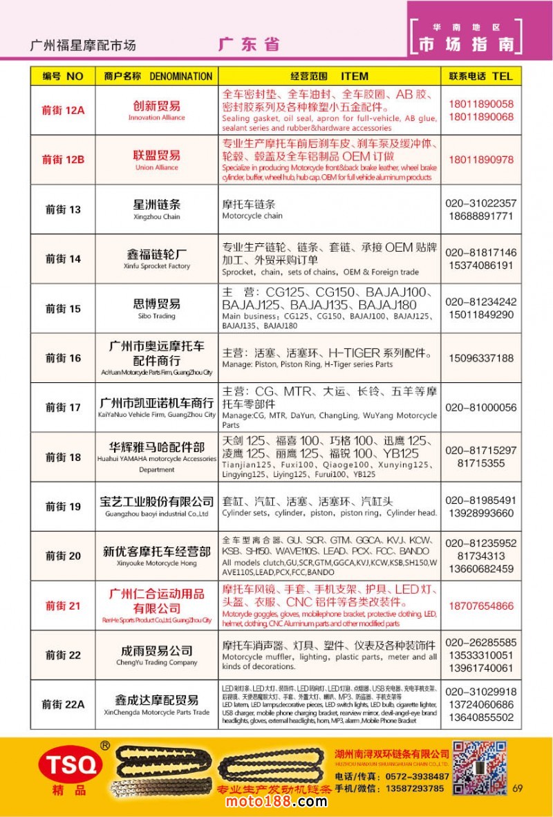 最新升級(jí)的《摩配華南市場(chǎng)指南》升級(jí)版在第76屆廣州全國摩托車及配件展示交易會(huì)上首發(fā),歡迎朋友們來3109號(hào)展位。接著將在廣州、重慶摩配市場(chǎng)全面派送,在廣州福星、松南市場(chǎng)門口、及白云三個(gè)檔口常年設(shè)立發(fā)行窗口;發(fā)行至廣州、重慶、江浙的幾大板塊主要廠家及全國的主要摩配市場(chǎng)。