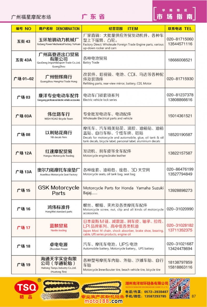 最新升級(jí)的《摩配華南市場(chǎng)指南》升級(jí)版在第76屆廣州全國(guó)摩托車(chē)及配件展示交易會(huì)上首發(fā),歡迎朋友們來(lái)3109號(hào)展位。接著將在廣州、重慶摩配市場(chǎng)全面派送,在廣州福星、松南市場(chǎng)門(mén)口、及白云三個(gè)檔口常年設(shè)立發(fā)行窗口;發(fā)行至廣州、重慶、江浙的幾大板塊主要廠家及全國(guó)的主要摩配市場(chǎng)。