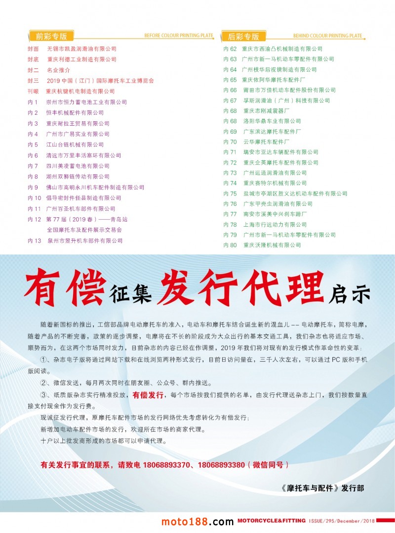 綜上所述,2019年我們將進(jìn)行兩項(xiàng)重大變革:以定位摩托車配件內(nèi)容為主體的《摩托車與配件》,將變更成電動(dòng)摩托與配件為主體《電摩與配件》;傳統(tǒng)紙媒為主的雜志,將變更為以互聯(lián)網(wǎng)+紙媒雜志,并以互聯(lián)網(wǎng)+新媒體為主。具體的舉措為: