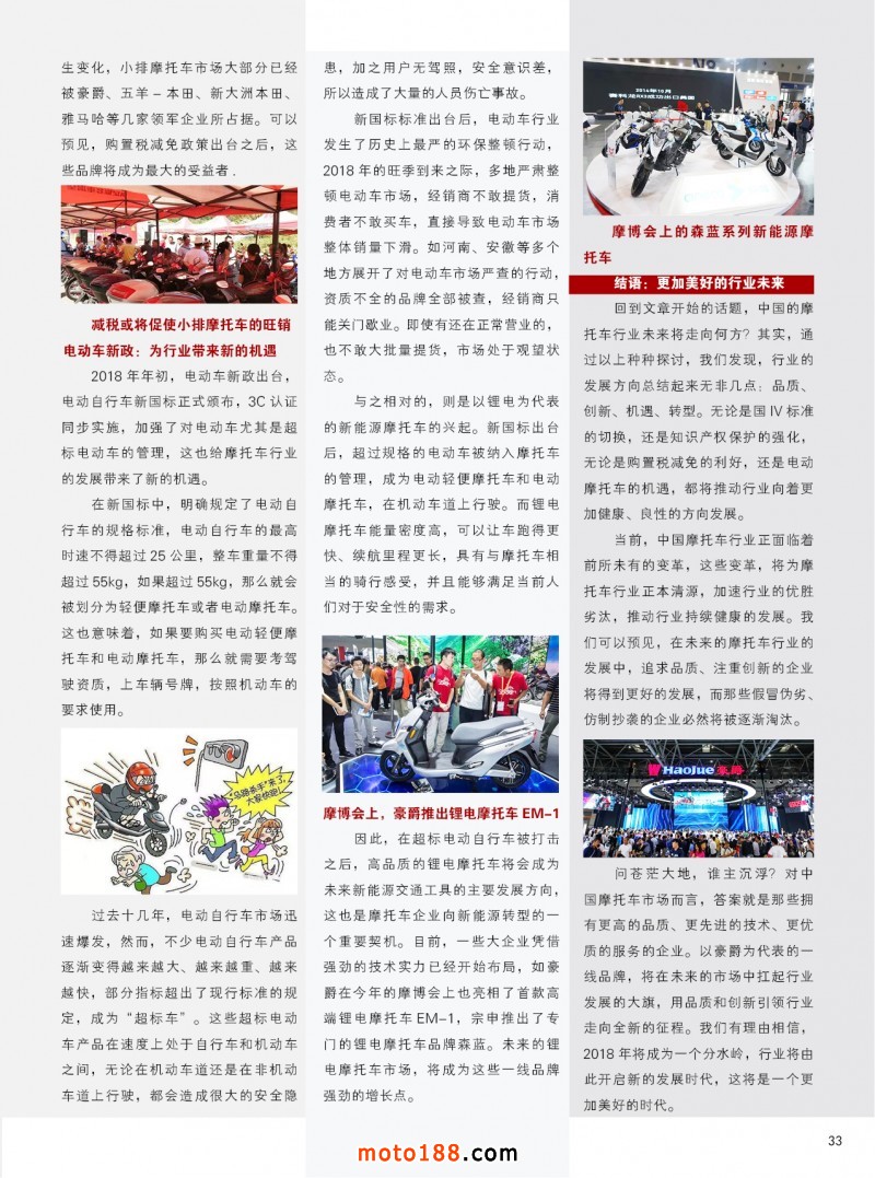 目前電動車新國標(biāo)即將實(shí)行,3C標(biāo)準(zhǔn)的強(qiáng)制認(rèn)證,國家新能源的戰(zhàn)略布局,也將給中國摩托車和電動車產(chǎn)業(yè)帶來革命性的變化,催生出未來的產(chǎn)品摩電或電摩:既有摩托車的速度和續(xù)駛里程,又有電動車的靜音無污染的工況…目前越來越多的企業(yè),正在朝著這個方向努力,并且已經(jīng)生產(chǎn)出不錯的產(chǎn)品,并推向市場,申請生產(chǎn)資質(zhì)的企業(yè)增多,隨著產(chǎn)品性能的提高和完善,相應(yīng)的配套政策出臺,消費(fèi)者不斷的增加,新能源電摩將會是市場新的消費(fèi)熱點(diǎn),我們未雨綢繆提早布局于這個未來新興市場,我們雜志也將定位于《電摩與配件》。  同時我們的服務(wù)形式也將逐步以新媒體來取代傳統(tǒng)媒體,今年大力度的壓縮出刊期數(shù),增加更多的新媒體的服務(wù)新形式,用更快捷、經(jīng)濟(jì)、方便、有效的方式和手段來服務(wù)于未來的企業(yè)。