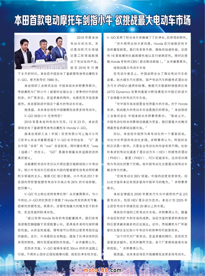 在這個(gè)春天里我們感受到和風(fēng)拂面,我們更堅(jiān)定了信心,我們傳統(tǒng)媒體務(wù)實(shí)的發(fā)展和經(jīng)營(yíng),基礎(chǔ)工作在不斷的加厚夯實(shí),今年我們雜志進(jìn)行了大調(diào)整,一年只在銷售季里出刊,全年出刊四期精品,本期雜志就有許多重要信息發(fā)布:政策面上的行業(yè)和地方上的重要政策(如前所述),18年的市場(chǎng)數(shù)據(jù)匯總分析,通機(jī)產(chǎn)品技術(shù)介紹 ,行業(yè)有關(guān)的重要國(guó)際資訊,國(guó)際巨頭研發(fā)生產(chǎn)的情況動(dòng)態(tài),電摩行業(yè)電動(dòng)三四輪及動(dòng)力電池最新的國(guó)家和地方政策,從海量的信息里精挑細(xì)選,每一遍文章都能讓讀者開(kāi)卷有限,同時(shí)還值得收藏。