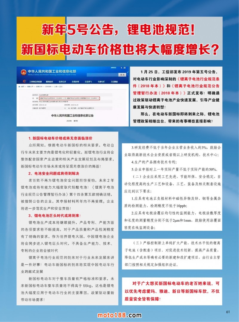 在這個春天里我們感受到和風拂面,我們更堅定了信心,我們傳統(tǒng)媒體務實的發(fā)展和經(jīng)營,基礎工作在不斷的加厚夯實,今年我們雜志進行了大調整,一年只在銷售季里出刊,全年出刊四期精品,本期雜志就有許多重要信息發(fā)布:政策面上的行業(yè)和地方上的重要政策(如前所述),18年的市場數(shù)據(jù)匯總分析,通機產(chǎn)品技術介紹 ,行業(yè)有關的重要國際資訊,國際巨頭研發(fā)生產(chǎn)的情況動態(tài),電摩行業(yè)電動三四輪及動力電池最新的國家和地方政策,從海量的信息里精挑細選,每一遍文章都能讓讀者開卷有限,同時還值得收藏。