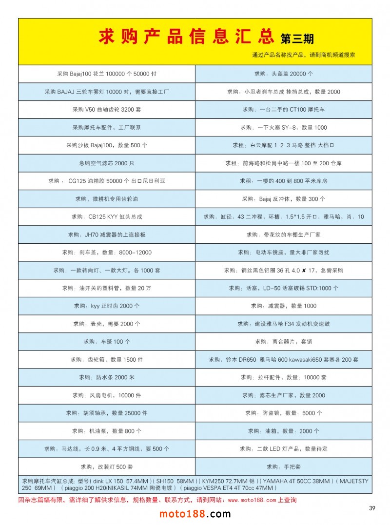 2019.5月《摩托車/電動(dòng)車與配件》雜志,歡迎大家閱讀日期:2019-05-08 點(diǎn)擊:1861 查看原圖 全部展開(kāi)![]() ![]() ![]() 內(nèi)39 求購(gòu)產(chǎn)口信息匯總 第三期