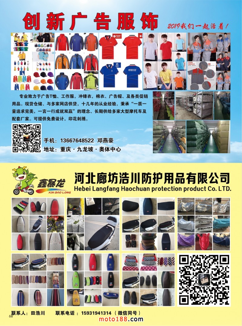 2019.5月《摩托車/電動車與配件》雜志,歡迎大家閱讀日期:2019-05-08 點擊:1860 查看原圖 全部展開![]() ![]() ![]() 內(nèi)68 創(chuàng)新廣告服飾