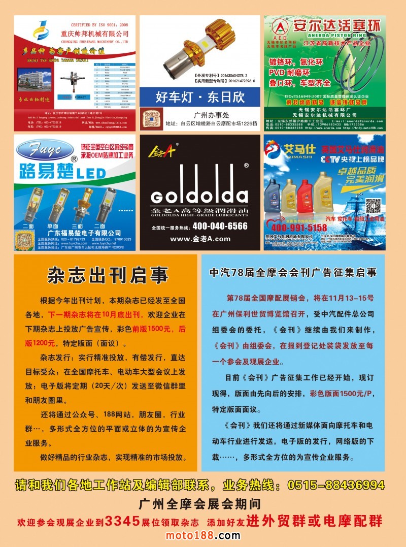 我們期待十一月份的行業(yè)的大聚會,我們的展位在3345號,就是樓上和樓下中間的結(jié)合部,目前我們已經(jīng)在為會議做準(zhǔn)備工作,會期的《電摩與配件》雜志和《會刊》的廣告宣傳征集已經(jīng)開始。