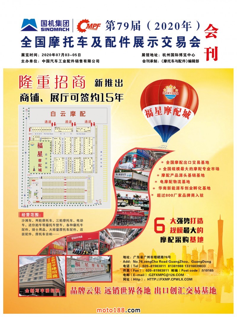 尊敬的各位行業(yè)同仁,原定7月于杭州國際博覽中心召開的“第79屆(2020春)全國摩托車及配件展示交易會(huì)”取消舉辦,原杭州會(huì)刊版面順延至下屆展會(huì)。感謝您的理解與支持!