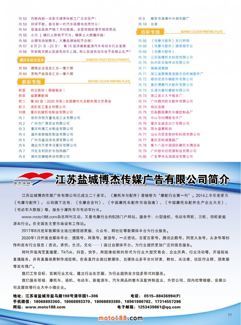 第18屆中國(guó)國(guó)際摩托車(chē)博覽會(huì)將于9月19-22日在重慶國(guó)際博覽中心舉行,本期雜志除正常發(fā)行之外,還將在重慶摩博會(huì)上發(fā)行。同時(shí)我們將做好終極版的《電摩與配件》11月雜志,以及廣州摩配會(huì)的《會(huì)刊》,善始善終,以完美的結(jié)局進(jìn)行收尾,不負(fù)行業(yè)不負(fù)你,不忘初心方得始終。