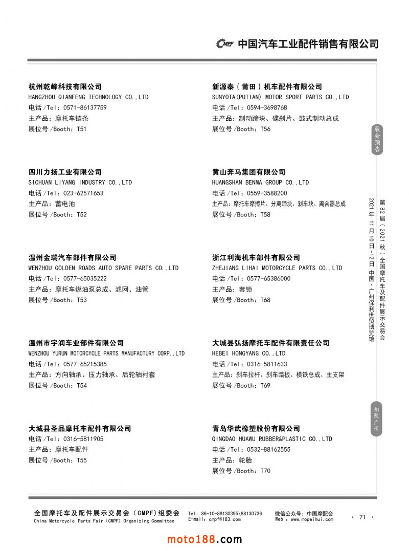 內(nèi)71 第81屆(2021春)全國摩托車及配件展示交易會-杭州站參展企業(yè)信息