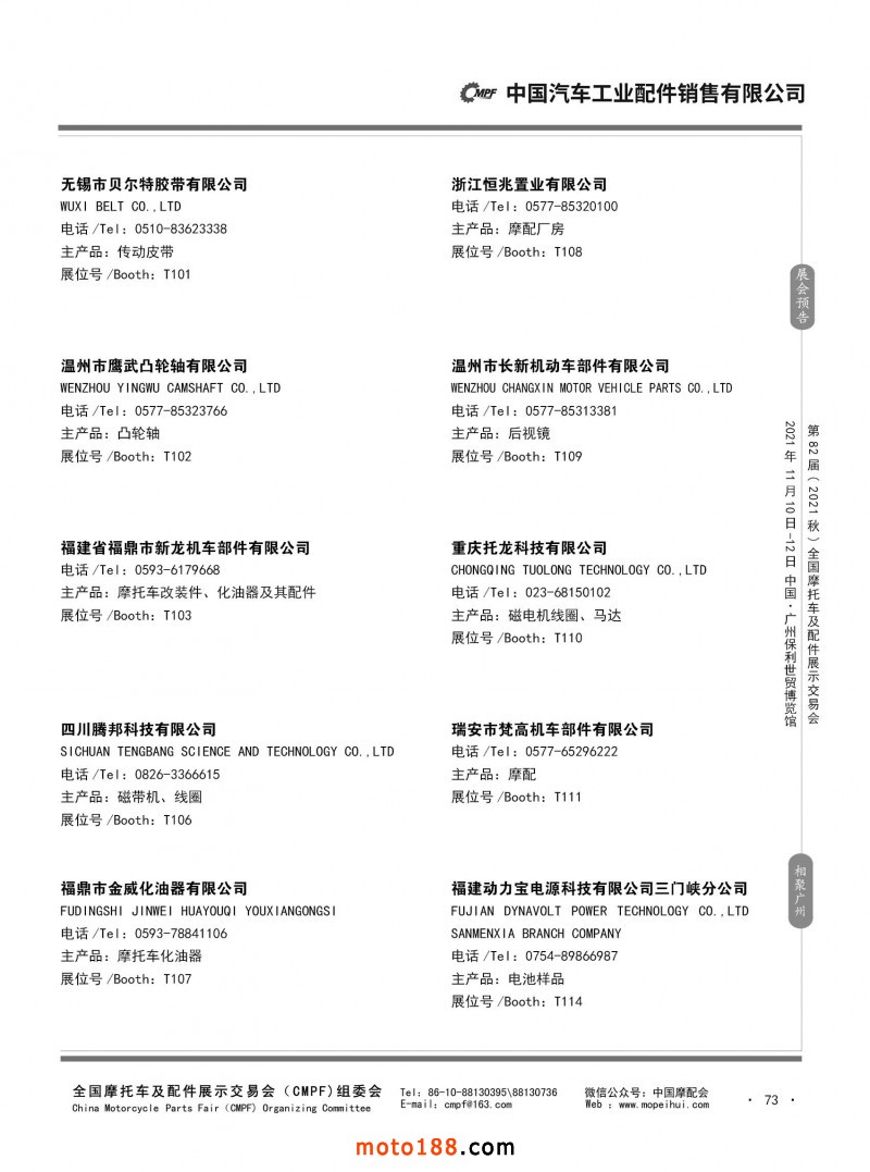 內(nèi)73 第81屆(2021春)全國摩托車及配件展示交易會-杭州站參展企業(yè)信息