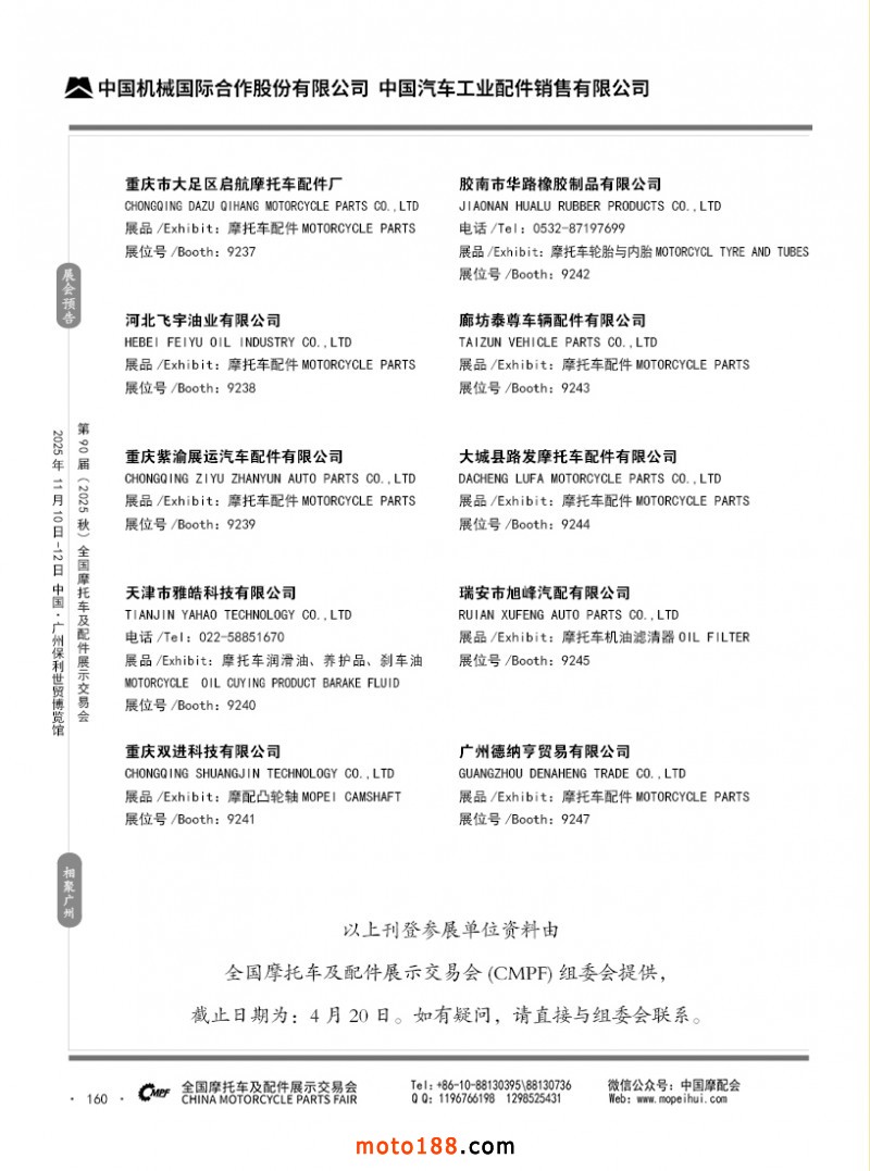 內(nèi)160 第89屆(2025春)全國摩托車及配件展示交易會-昆明站參展企業(yè)信息