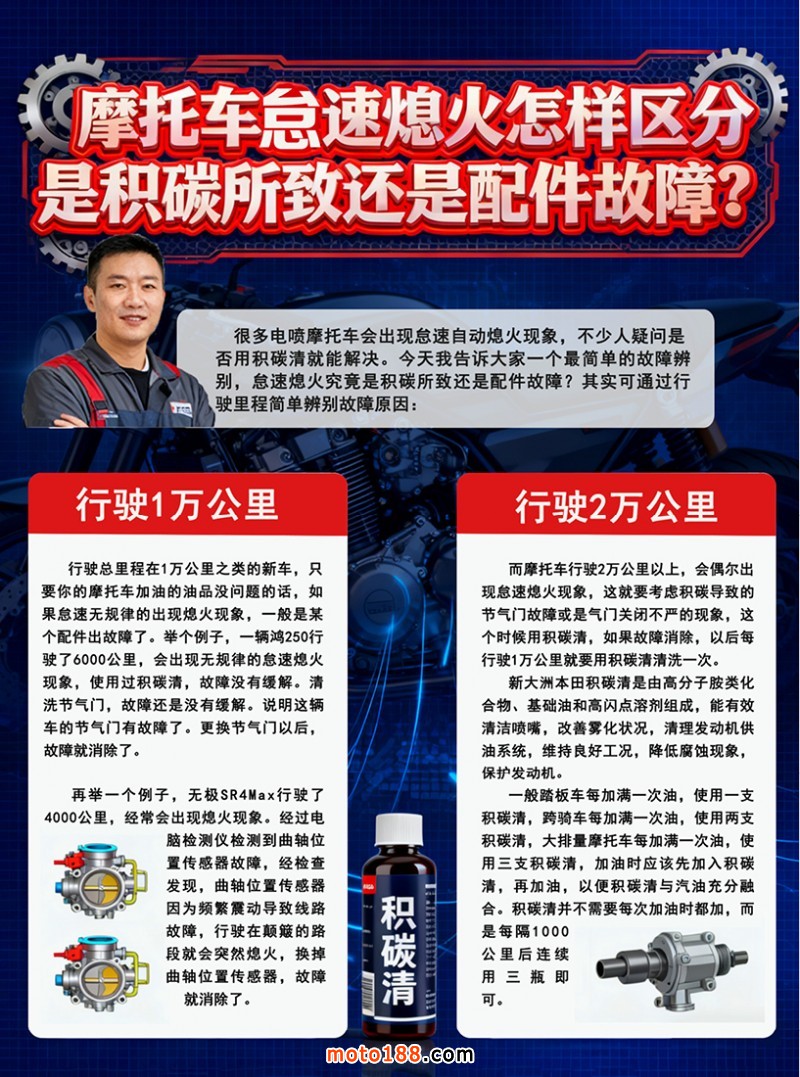 內(nèi)20 摩托車怠速熄火怎樣區(qū)分是積碳所致還是配件故障?