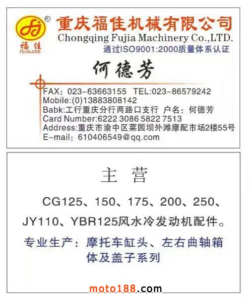 重慶福佳機(jī)械有限公司,專業(yè)生產(chǎn):摩托車缸頭、左右曲軸箱體及蓋子系列,聯(lián)系方式:023-63663155、13883808142 何德芳。