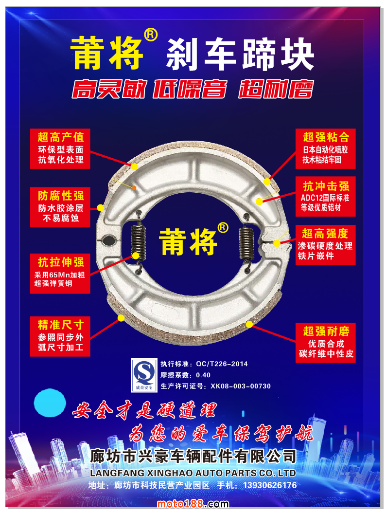 廊坊市興豪(中興)車輛配件有限公司分設摩托車制動蹄塊生產(chǎn)廠區(qū)與汽車火花塞、摩托車火花塞、園林機械火花塞、工業(yè)火花塞生產(chǎn)廠區(qū)。本公司是一家集自主研發(fā)、生產(chǎn)、銷售為一體的綜合型企業(yè)!產(chǎn)品均通過ISO9001:2000國際質量管理體系認證。公司擁有完善的管理體系和質量控制體系,嚴把質量關,把質量比作公司的生命,把信譽比作與客戶溝通的橋梁。公司注冊商標有莆將、悍江、捷名克、JEMIK等,所有產(chǎn)品性能穩(wěn)定,質量可靠,價格合理,深受國內(nèi)外客商一致好評!我們以尋求高品質為基礎,以誠信經(jīng)營為理念,歡迎國內(nèi)外摩配界精英蒞臨指導!承接外貿(mào)訂單OEM貼牌。微信:13930626176,手機:13930626176。