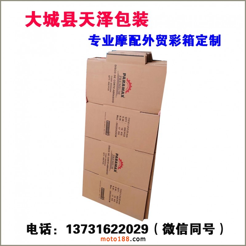 專業(yè)摩配外貿(mào)彩箱定制,1個(gè)起定!沒有版費(fèi),當(dāng)天出貨,可以發(fā)廣州、邢臺(tái)等摩配集散地。電話