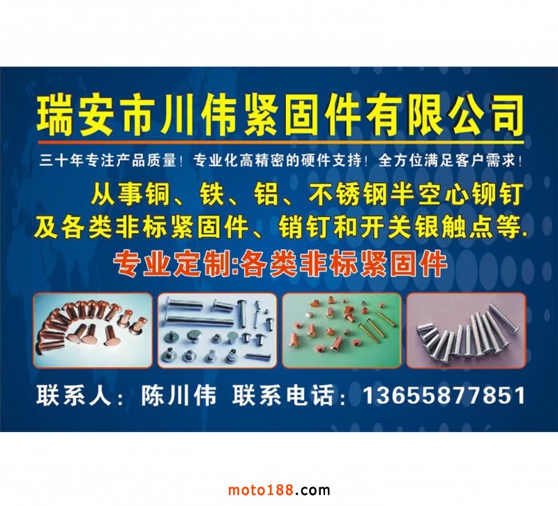 【瑞安市川偉緊固件有限公司】專業(yè)生產(chǎn)銅鐵鋁不銹鋼鉚釘,銷釘,觸點(diǎn)設(shè)備精良技術(shù)力量雄厚!與國內(nèi)外兩百余家汽摩配知名廠家皆有合作,產(chǎn)品遠(yuǎn)銷東南亞,德國,日本等!