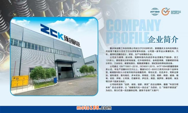 是一家專業(yè)從事摩托車,汽車,通用機(jī)活塞的設(shè)計(jì)、研發(fā)、生產(chǎn)與銷售的企業(yè)。 公司通過GB/T19001-2016 ISO9001:2015ATE16949質(zhì)量管理體系認(rèn)證,年生產(chǎn)活塞800萬只以上,覆蓋50CC-800CC系列300多個(gè)品種車型,暢銷國內(nèi)各大小區(qū)域市場并遠(yuǎn)銷墨西哥、哥倫比亞、厄瓜多爾、哥斯達(dá)黎加、玻利維亞、委內(nèi)瑞拉、多米尼加、阿根廷、巴西、朝鮮、韓國、越南、緬甸、老撾、伊朗、土耳其、巴基斯坦、伊拉克、美國、俄羅斯、摩洛哥、埃及等20多個(gè)國家及地區(qū)。