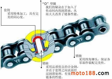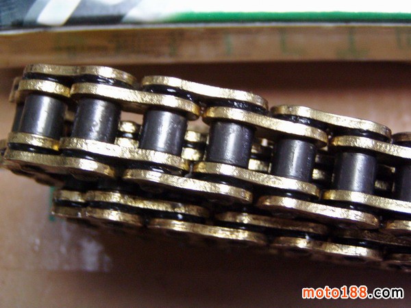 摩托車O型密封圈鏈條(油封鏈)是專門為摩托車道路飆車和賽車設(shè)計(jì)生產(chǎn)的高性能傳動(dòng)鏈。鏈條帶有特種O型密封圈,以便密封鏈條中的潤(rùn)滑油隔絕粉塵及泥土。鏈條顏色可為本色噴丸、金黃(鍍銅)及銀色(鍍鎳),其中鍍銅/鍍鎳摩托車鏈條通常為鏈條的內(nèi)外鏈板鍍銅或鍍鎳,也可所有零部件全部鍍銅或鍍鎳油封鏈條。