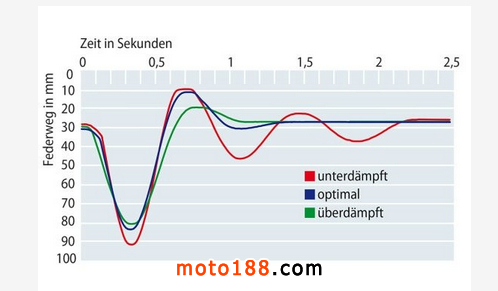 下圖中,縱軸表示彈簧的行程,橫軸表示時(shí)間。藍(lán)線是最佳狀態(tài),紅線表示避震偏軟,恢復(fù)時(shí)間太長,需要加大。綠線表示避震偏硬,需要減小。