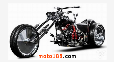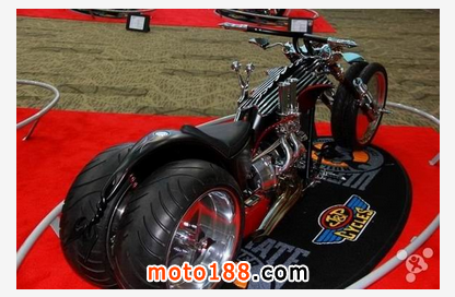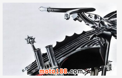 Twisted Evil摩托車采用的是霸氣的四輪設(shè)計,碩大的雙后輪給人一種十分強(qiáng)悍的感覺。車身整體采用的是黑銀相間的配色,大量銳利的裝飾顯得侵略性十足。從這點來說,Twisted Evil確實蠻邪惡的。