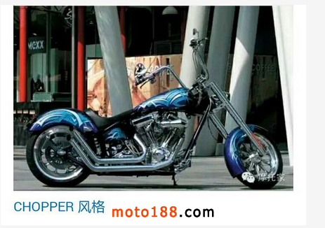 chopper其實(shí)就是現(xiàn)在那些視覺沖擊很強(qiáng)的手工定制車,什么大屁股(指的是寬大后輪胎),典型的還有大狗(就是那些把前車架抬的很高的車)應(yīng)為車架給抬高了,所以減震自然的也就需要更長的,全車量閃閃的手繪油漆配合大面積的電鍍件。