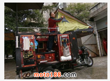 核心提示: 用農(nóng)用三輪摩托車改裝,在面積不超過3平方米的車廂上,有廚房、臥室、書桌和各種野外生存工具等。經(jīng)過查看各種資料和對(duì)比,何