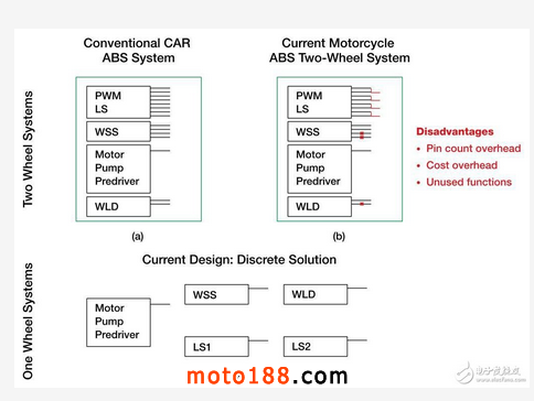 通常,摩托車生產(chǎn)商的一級(jí)供應(yīng)商提供的是雙輪和單輪系統(tǒng)。借助雙輪系統(tǒng),也可使用針對(duì)乘用車設(shè)計(jì)的ABS AMS IC,因?yàn)樗鼡碛凶銐虻墓δ?。然而,若要保證單輪系統(tǒng)的成本效益,必須采用一種完全不同的方法來實(shí)現(xiàn)單輪制動(dòng) – 也就是一種獨(dú)立設(shè)計(jì)。這就需要采用兩種完全不同的設(shè)計(jì)/開發(fā)路徑。圖4展示了雙輪系統(tǒng)中ABS AMS IC的組合輸出和未使用輸出,以及相關(guān)劣勢(shì),還顯示了一個(gè)獨(dú)立的單輪系統(tǒng)解決方案。