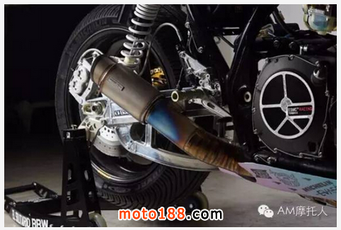 車輛改裝的重點放在了性能的提升和造型的設計上。因此,除了車架、油箱和車把之外,其他的部件全部為改裝件,這就導致車重驟降了25%,從245kg降到了183kg。同時,通過加大發(fā)動機進氣量,提高壓縮比(從9.7:1提高到10.7:1),更換鈦合金的連桿和缸頭等一些列改裝,使得馬力暴增到了148hp。大馬力低配重,引擎輸出的功率比和市面上的運動型賽車絕對有一拼,介于BMW S1000 RR 和Ducati 1299 Panigale之間。