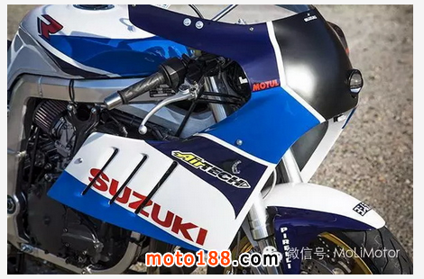 復(fù)古車(chē)配件,讓他成為終極的道路使用車(chē). 他發(fā)現(xiàn)在美國(guó)有一家Airtech公司有生產(chǎn)整套AMA Yoshimura F1 復(fù)刻版整流罩, 馬上訂購(gòu)把東西送到德國(guó)準(zhǔn)備烤漆與貼紙的制作, 第一件事情就是把所有整流罩噴成北極白,Suzuki專用的配色,還有貼上贊助商貼紙!