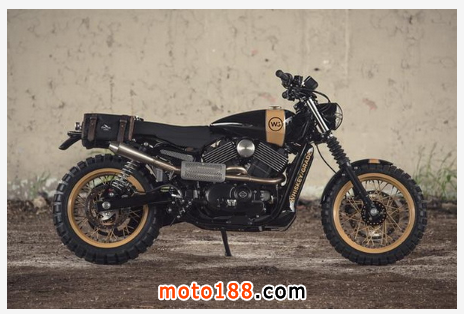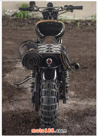 全車(chē)有二十多處改裝,最直觀(guān)的改裝就是升高車(chē)座,尾部改短。輻條輪轂加上龜背胎符合Scrambler的特性,排氣也進(jìn)行了升高。同時(shí)還改裝了油箱、LED燈、后減震等。細(xì)節(jié)方面Analog Motorcycles特意在尾部加裝了行李架,并在兩側(cè)掛了兩個(gè)行李袋,讓尾部不會(huì)顯得太過(guò)突兀,而在水箱兩側(cè),還印上了車(chē)主的姓名,更讓這款車(chē)與眾不同。