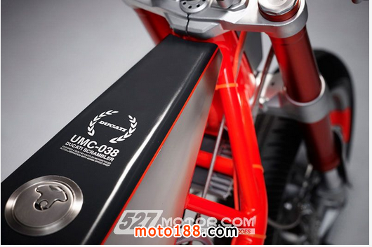 新車最具視覺沖擊力的就是裸露的紅色鋼管編織車架,為了與之相配,設(shè)計(jì)師將原款搖臂更換為Monster S2R的搖臂,讓新車的整體造型更為統(tǒng)一;另外,設(shè)計(jì)師還將Scrambler的前減震更換為鈴木GSX-R車型的Showa減震,并采用了Monster M796(前)和Monster 1100(后)的17英寸輪圈;新車采用LED頭燈和尾燈,尾燈的設(shè)計(jì)十分巧妙,因?yàn)樗饶茏魑矡?,又能作轉(zhuǎn)向燈,這樣做的目的應(yīng)該是為了節(jié)約空間,保證新車簡潔的風(fēng)格。