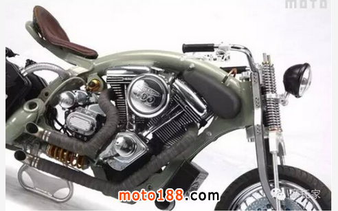 引擎與變速箱被固定于下鋼梁與中央龍骨上之間,在引擎的選擇上,sbay提供了多款S&S和Rev Tech的v2引擎給予車主們進(jìn)行選購,而在這輛試作車型上,所搭載的是Rev Tech 1702c.c.排量的v2引擎,為了克服油桶被擺放在后搖臂后產(chǎn)生的汽油供應(yīng)效率的問題,sbay用高壓泵浦,讓汽油能快速地供應(yīng)給引擎。在引擎的進(jìn)、排氣方面,進(jìn)氣采用了sbay自制的高流量空濾,排氣管則為手工燒焊的訂制品(管徑為52mm)??剂康絭2雙缸容易產(chǎn)生的排氣脈沖現(xiàn)象,因此兩缸分別對(duì)應(yīng)獨(dú)立排氣,并在外層管壁裹上隔熱布,隔熱的同時(shí),還擁有視覺效果。