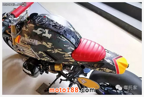拉近距離,許多車輛改裝的細(xì)節(jié)漸漸浮現(xiàn),例如油箱造型就是整臺(tái)車最重要的精神所在,上方印有 R9TRACKER,并以迷彩配色做為基底,當(dāng)然 BMW 的廠徽依然擺放于車輛上,讓人一眼就能認(rèn)出這臺(tái)是 BMW 的車款改裝而來。