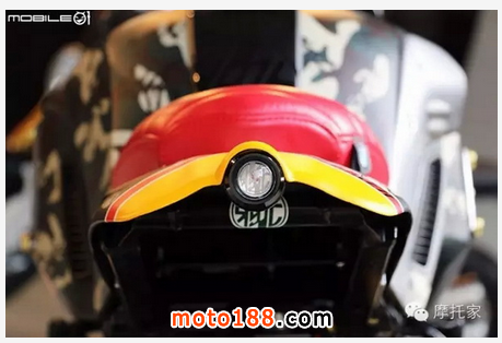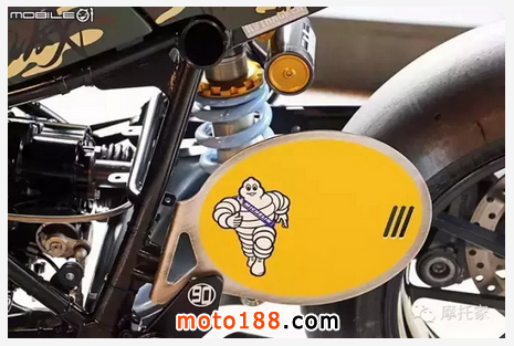 左方腳踏上還有一塊類似賽車號(hào)碼牌的設(shè)計(jì),但刻意不填上編號(hào)的原因據(jù)設(shè)計(jì)者表示,其實(shí)是希望讓車輛有種隨時(shí)可以參賽,卻又還沒決定正式編號(hào)的感觸,因此上端只有貼上輪胎廠商米其林的貼紙,底部的鋁合金也有做舊化處理,增添質(zhì)感。