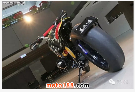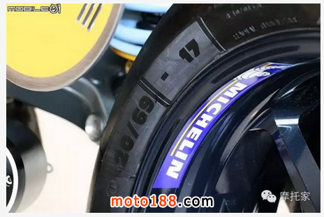 前后輪均采用 MICHELIN 米其林所生產(chǎn)的競(jìng)技胎種,因此后輪輪胎規(guī)格也是少見的 20/69-17 全熱熔胎種。