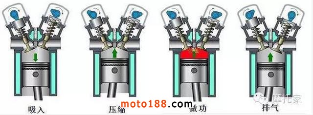 首先,想要搞懂發(fā)動機的區(qū)別,我們首先得明白四沖程發(fā)動機的工作原理,四沖程發(fā)動機工作步驟是:吸氣 壓縮 做功 排氣 四個沖程。