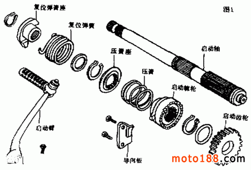 啟動(dòng)時(shí),踩下啟動(dòng)臂,啟動(dòng)軸轉(zhuǎn)動(dòng),啟動(dòng)軸上的啟動(dòng)棘輪也隨之轉(zhuǎn)動(dòng);啟動(dòng)棘輪外圓上的凸塊脫離導(dǎo)向板限制,棘輪被壓簧推向啟動(dòng)齒輪,并與啟動(dòng)齒輪側(cè)面的棘齒嚙合,使啟動(dòng)齒輪同步轉(zhuǎn)動(dòng);然后通過(guò)副軸和主軸上的一擋齒輪及處于結(jié)合狀態(tài)的離合器,將動(dòng)力傳遞到發(fā)動(dòng)機(jī)曲軸上,并最終啟動(dòng)發(fā)動(dòng)機(jī)。啟動(dòng)后,駕駛者迅速放松啟動(dòng)臂,在復(fù)位彈簧作用下,啟動(dòng)軸反轉(zhuǎn),啟動(dòng)棘輪上的凸塊沿著導(dǎo)向板的斜面上移,使棘輪與啟動(dòng)齒輪脫開(kāi)嚙合。這樣,啟動(dòng)齒輪只是在啟動(dòng)軸上空轉(zhuǎn),而不帶動(dòng)啟動(dòng)軸。如啟動(dòng)后未及時(shí)松開(kāi)啟動(dòng)臂,則啟動(dòng)齒輪與啟動(dòng)棘輪的棘齒之間處于打滑狀態(tài),以防損壞啟動(dòng)機(jī)構(gòu)。
