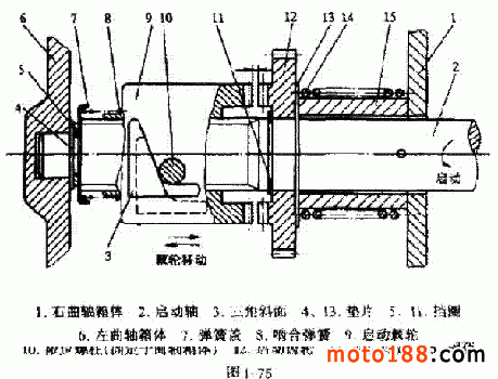 啟動棘輪在轉動過程中,三角斜面與限位螺柱的相對位置發(fā)生變化,在嚙合彈簧的作用下,啟動棘輪便向右移動。當啟動軸轉動到一定角度時,啟動棘輪棘齒便完全與啟動齒輪左側面上的棘齒嚙合,從而帶動啟動齒輪轉動,啟動發(fā)動機。發(fā)動機啟動以后,啟動軸失去外力(踏動啟動蹬桿的力)作用,便在回位彈簧的作用下,順時針轉動。啟動棘輪隨之順時針轉動,并在限位螺柱作用下,向左移動,脫開與啟動齒輪的嚙合。