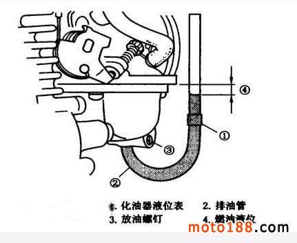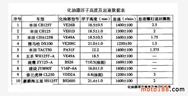 (3)擰松浮子室放油螺釘,將泄油管口垂直向上,放置于化油器本體面上,然后慢慢向下移動,直至燃油從泄油管口溢出時為止,此時的位置即為該缸化油器油位。正常的油位應在化油器本體與浮子室結合面向下 2±1mm 之間(如上圖所示)。若油位過高,可通過調(diào)整浮子臂舌來實現(xiàn)(可參考表化油器浮子高度及怠速數(shù)據(jù)表所示)。如油位正常,則先檢查該缸化油器的加濃閥是否在關閉狀態(tài)以及加濃閥橡膠平面是否密封,并視情予以檢修。加濃閥不泄漏時,可將化油器上蓋打開,取出真空膜片閥,從閥體內(nèi)取出主油針。將油針卡簧往上提一擋,混合氣會變稀,往下提一擋,混合氣會變濃。復裝所卸零件,再按上述試車方法重新進行驗證,直至火花塞的電極顏色呈棕紅色為止。