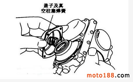 (6)在清洗化油器的空氣通路和燃油通路時,如是等真空膜片閥式結構,必須卸下膜片,再吹洗。否則會損失膜片。復裝時,可用食指托住真空柱塞至負壓室一側(如上圖所示),注意使膜片閥的方向標記對準化油器本體上的凹形槽,再依次裝上彈簧、真空室蓋。
